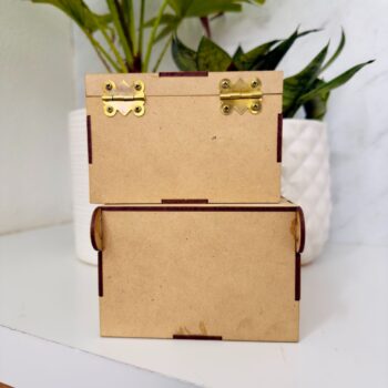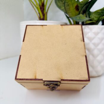 A sturdy square MDF box with a secure latch, measuring 4″ x 4″ x 3.5″. It’s perfect for storing small keepsakes, craft supplies, or gifts, and can be easily personalized with paint or embellishments.